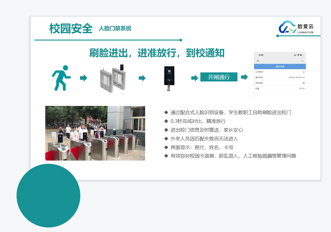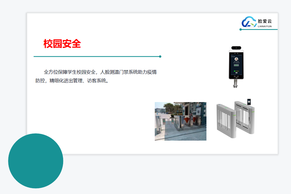 校門口:安裝智能人臉識別閘機、訪客機、和抓拍機,對出入人員進行人臉身份識別和大數(shù)據(jù)分析,充分考慮訪客系統(tǒng)和人員出入控制的結(jié)合,實現(xiàn)人臉身份驗證、出入管理、學生請假管理、簽到考勤等系列功能,滿足校園場景綜合管理的需求。