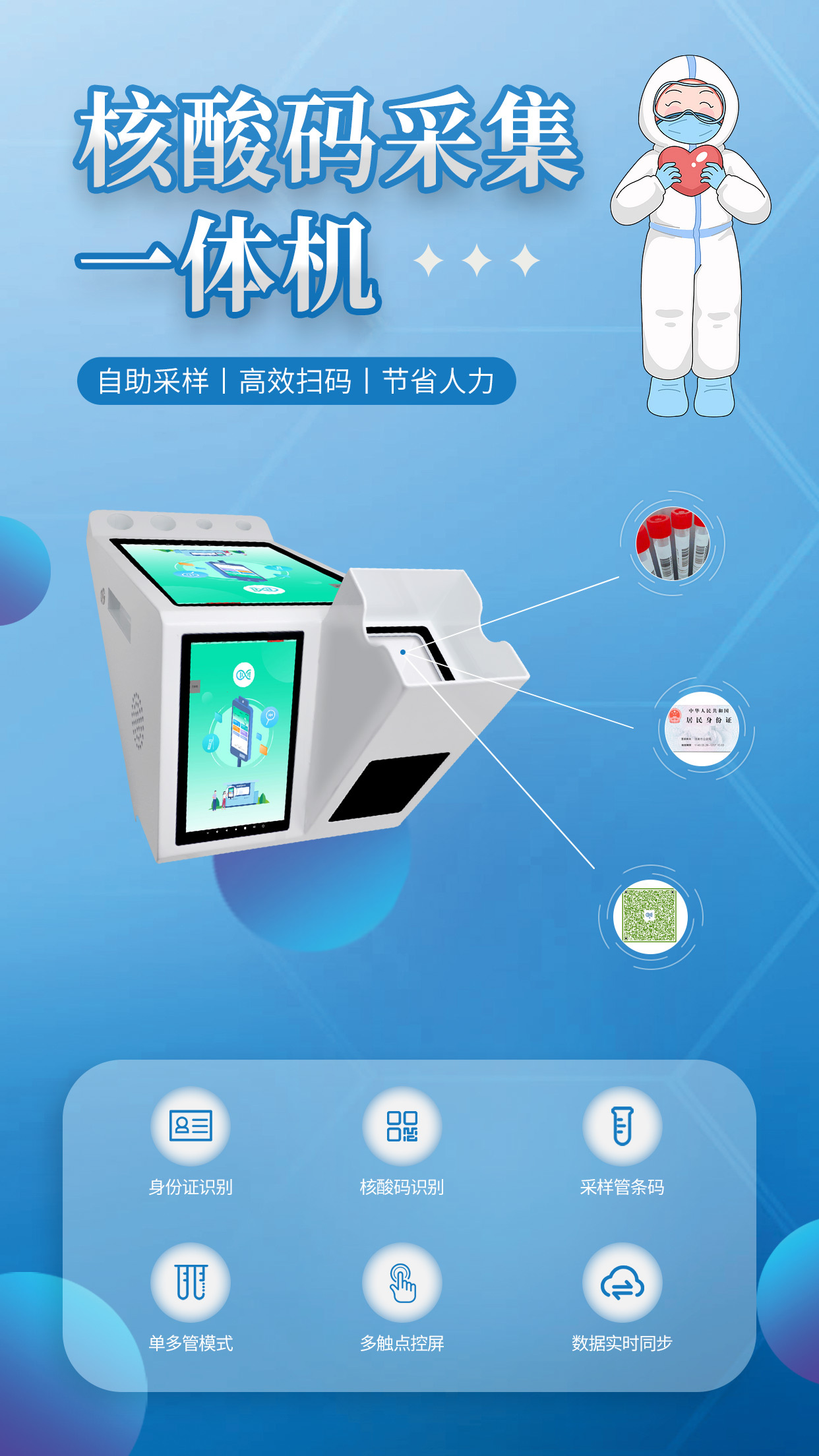 ①解決疼點:核酸采集過程中存在的時間緊,任務(wù)重,人手壓力大等問題。